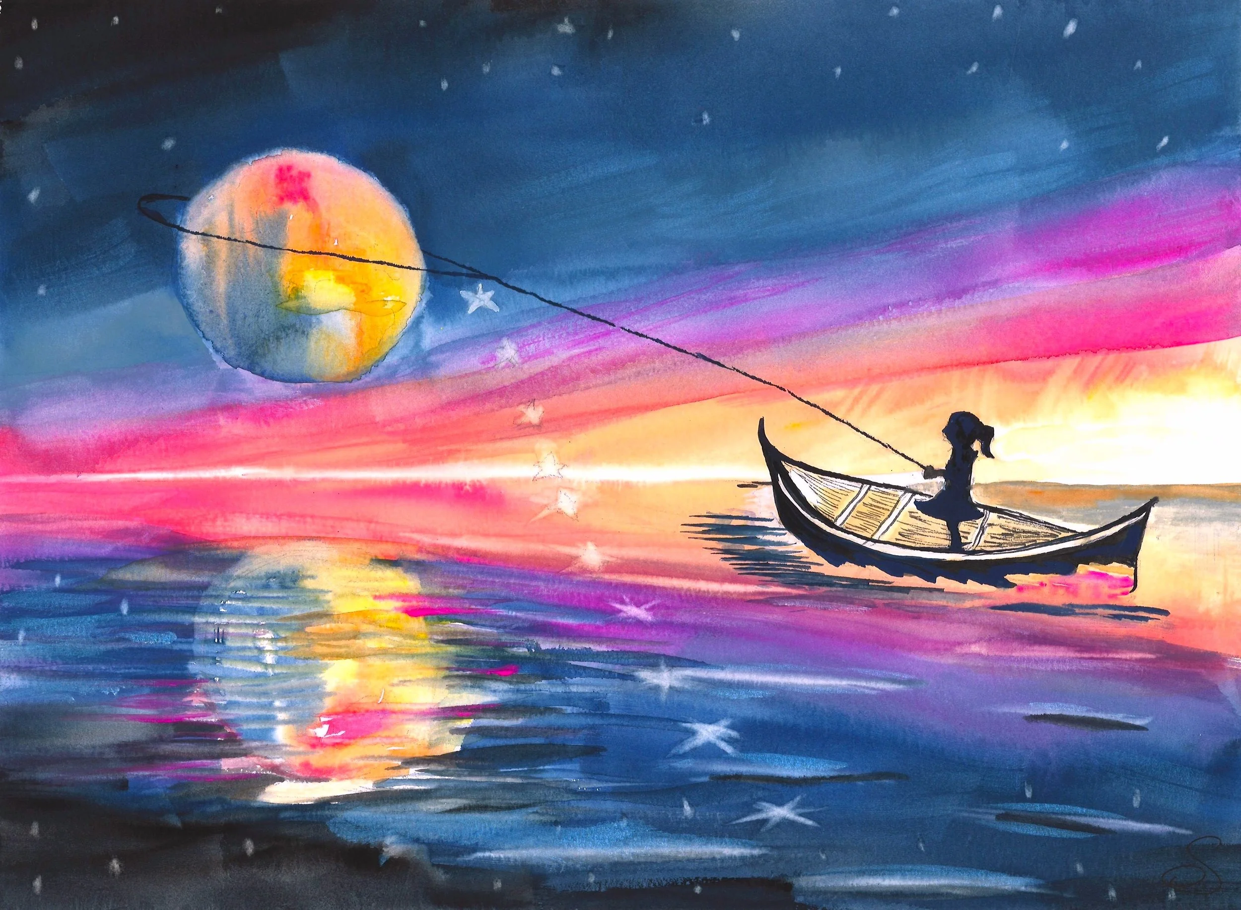 Anything is possible if you dream it. Whimsical and fresh. Gouche with metallic finish on watercolor paper.