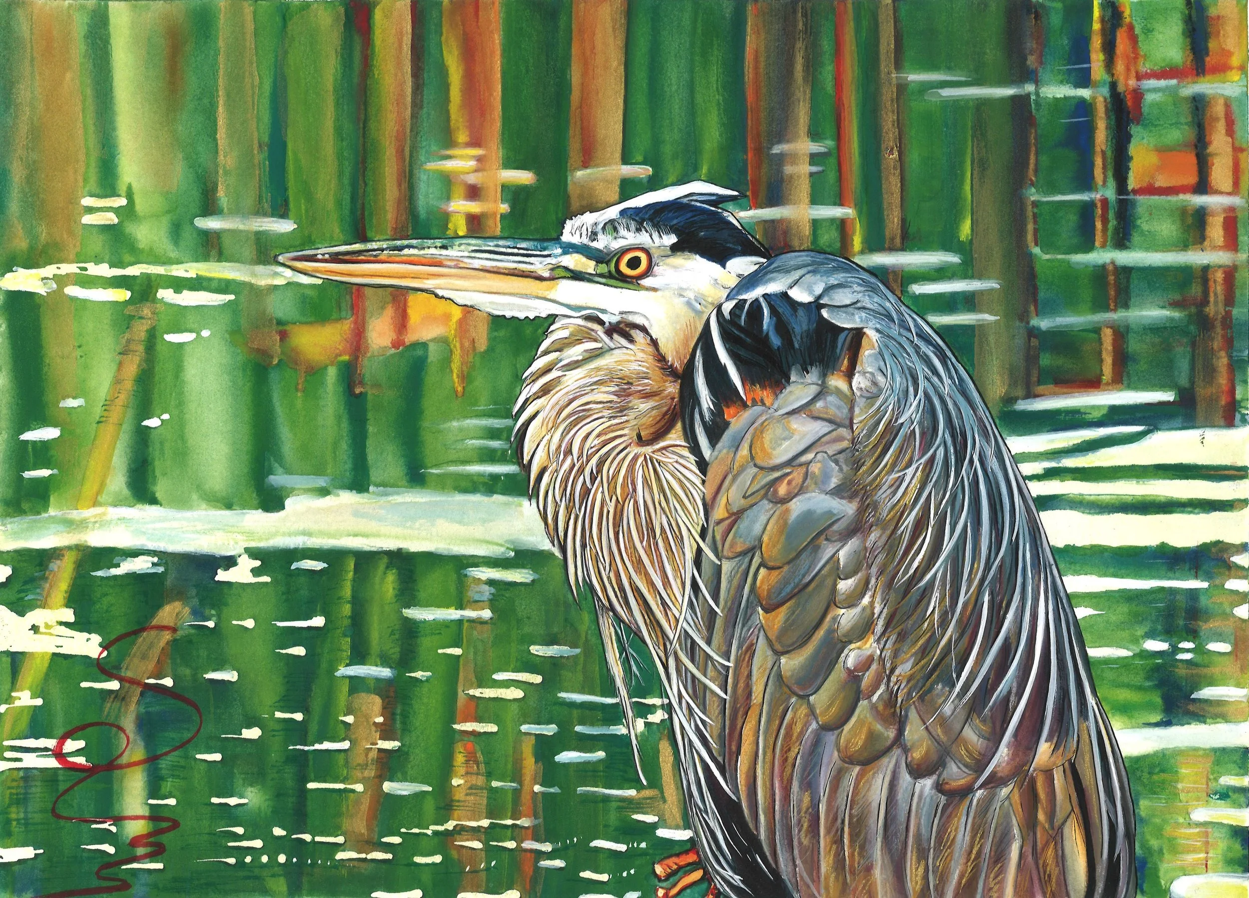 The Great Blue Heron brings inner peace and stability. This painting depicts the mysterious bird perched along the shore of Vadnais Lake. Gouache paint with gold accent on 11x15 watercolor paper.