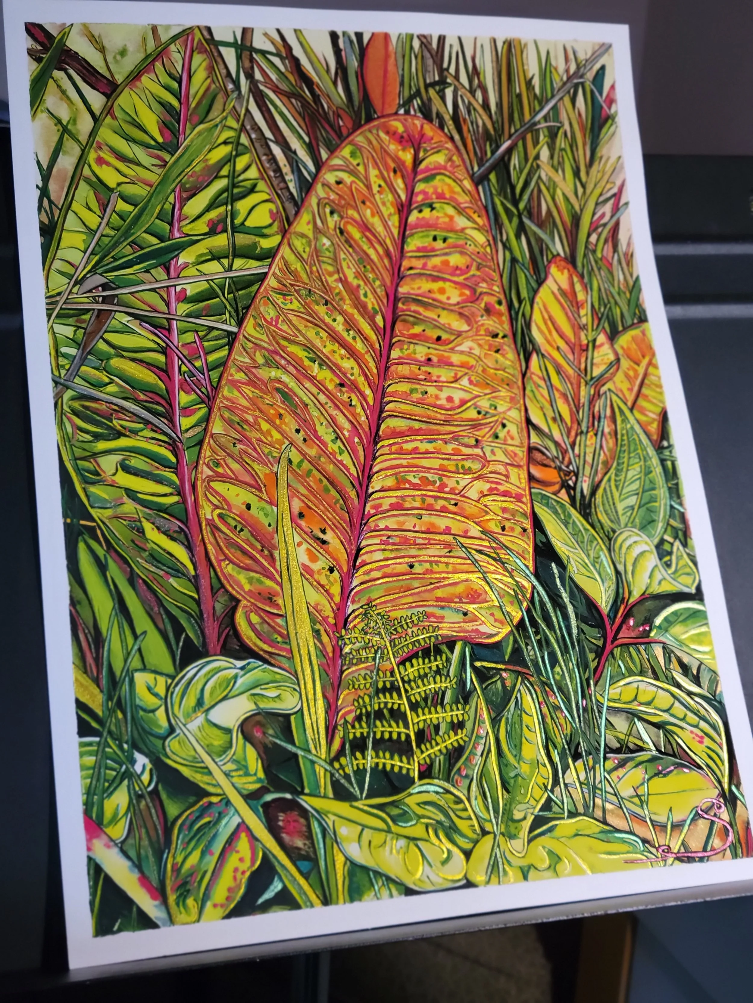 This bright, textured painting will bring the viewer inside with its 3-dimensional feel. Gouache paint finished with a rainbow of metallic overlay on 11x15 watercolor paper.