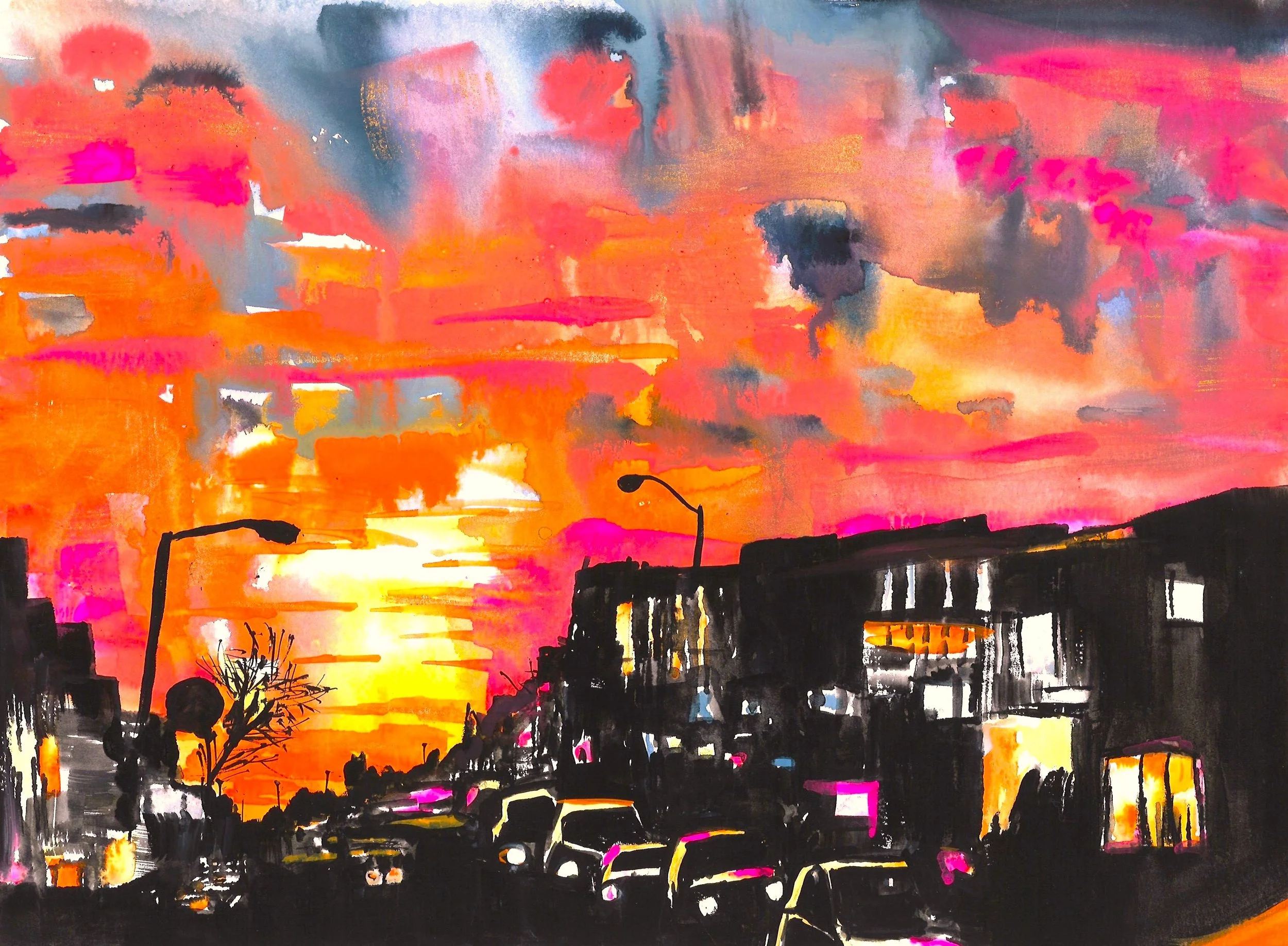 Toronto SunsetModern and bright inspired sunset painting. Gouache on watercolor paper. Copyright 2020 Sarah Boyle Carmack Buy more at thegoldenspyglassToronto Sunset Latte Mug 12 Oz. - Etsy